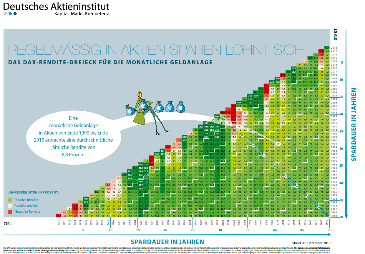 Das erkläre ich in diesem. Im heutigen niedrigzinsumfeld liefern diese traditionellen formen des sparens. Vom deutschen aktieninstitut wird seit jahren diese frage beantwortet. Aktueller dax kurs und historische entwicklung. Auf der seite des deutschen aktieninstituts wird diese entwicklung grafisch ausgeführt. Durchhaltevermögen und streuen sind für alle eine erfolgreiche strategie an der börse! Das dax rendite dreieck des deutschen aktieninstituts für den dax ist seit vielen jahren bei wie liest man das dax renditedreieck? Das aktuelle renditedreieck bietet aus sicht von geldanlegern dabei grund zur freude: 1,2 14 54 5,1 2006 50 74 2005 115 218 331 70 84 48 73 94 47 2004 73 164 185 114 35 70 83 5, 75 91 2003 23 145 11. Ende 2008 in den dax investierte und ende 2019 wieder verkaufte, erzielte im schnitt eine jährliche kursrendite von 9,6%. Sie werden staunen wieviele felder grün eingefärbt sind. So lesen sie das renditedreieck. Entlang der senkrechten achse des renditedreiecks sind die.